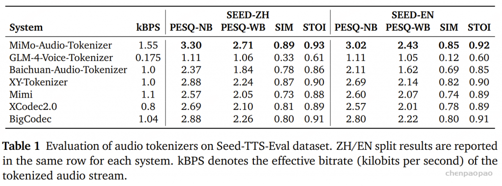 结果(Results)如 表 1 所示。MiMo-Audio-Tokenizer 在 Seed-TTS-Eval 上展现出出色的重建质量。关键在于,这些提升是在下游建模所使用的码本上测得的,说明 MiMo-Audio 完整保留了语音信息的声学特性,从而在各种语音任务中展现出强大的泛化能力。