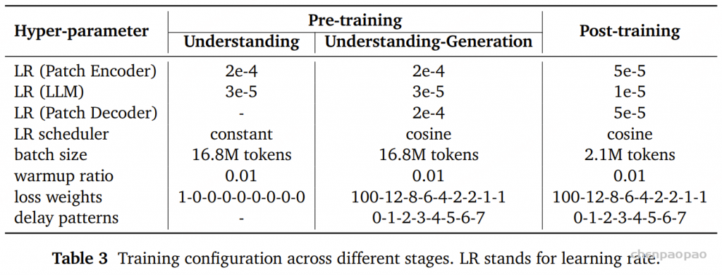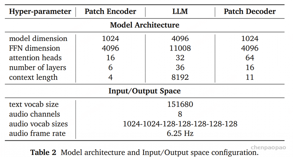 在后训练阶段,模型的所有参数——包括 patch encoder(音频块编码器)、LLM(语言模型) 和 patch decoder(音频块解码器)——都进行了微调。