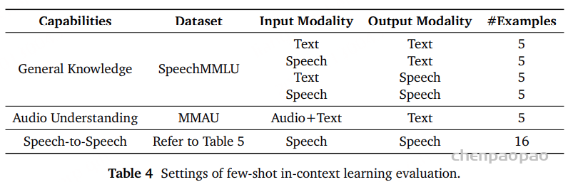- 评估。构建了一个全面的评测基准(benchmark),用于严格评估模型在语音领域的上下文学习能力。该基准涵盖模态不变的常识知识、听觉理解与推理能力以及多样化的语音到语音生成任务多个维度。