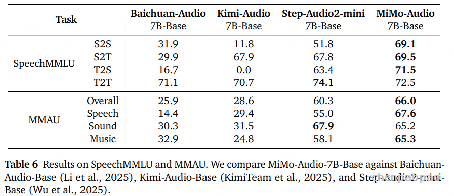 这一优势不仅体现在整体得分上,也体现在各子任务上的性能均衡性。在 MMAU 总得分 上,MiMo-Audio 取得了 66.0 分,比排名第二的 Step-Audio2 mini-base(60.3 分) 高出 5.7 分。相比 Kimi-Audio-base(28.6 分) 和 Baichuan-Audio-base(25.9 分),MiMo-Audio 的成绩有显著优势。这种总分上的领先直观地体现了模型整体性能的优越性。