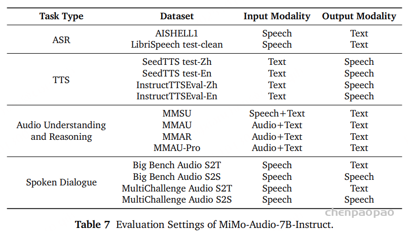 在后训练阶段完成后,我们对 MiMo-Audio-7B-Instruct 模型进行了系统性的综合评估,涵盖了以下主要任务领域: