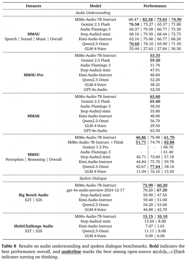 综上,MiMo-Audio 是唯一能在所有语音推理任务中保持高水平性能的模型,体现了其在语音理解与生成间的深度整合能力。