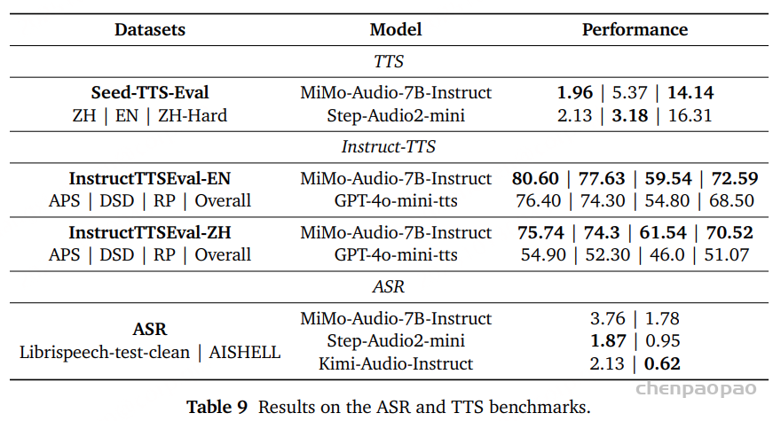 如表 9 所示,MiMo-Audio-7B-Instruct 在开源大规模语音模型中,在 ASR(语音识别) 和 TTS(语音合成) 任务上均展现出强劲性能。