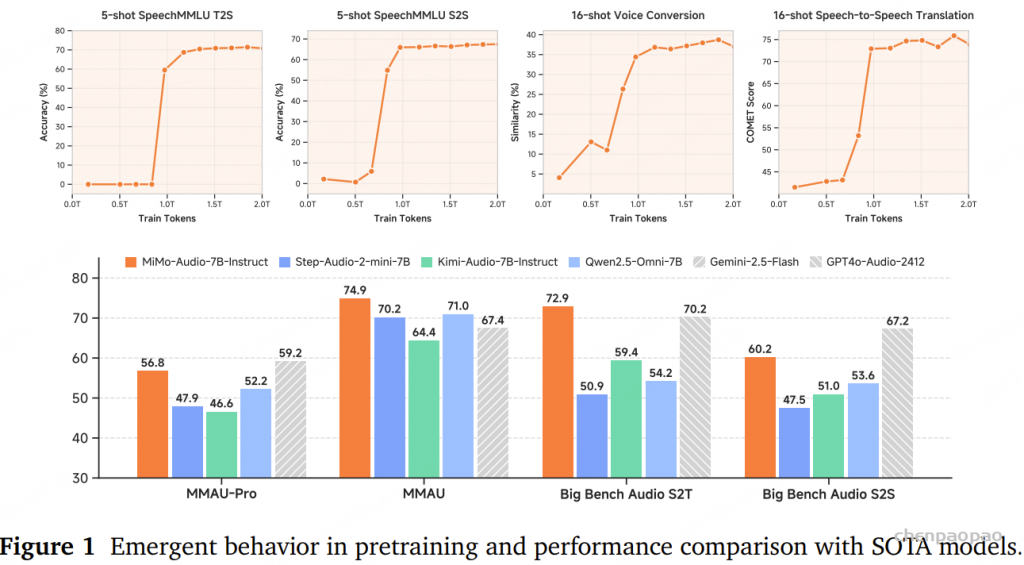 现有的音频语言模型通常依赖于针对特定任务的微调来完成特定的音频任务。相比之下,人类只需少量示例或简单指令就能将能力推广到新的音频任务上。GPT-3 已经证明,通过扩展下一个 token 预测的预训练可以在文本上实现强大的泛化能力,我们认为这一范式同样适用于音频领域。通过将 MiMo-Audio 的预训练数据规模扩展到超过一亿小时,我们观察到其在多种音频任务上出现了少样本学习能力。我们对这些能力进行了系统评估,发现 MiMo-Audio-7B-Base 在开源模型中,在语音智能和音频理解基准上均实现了SOTA性能。