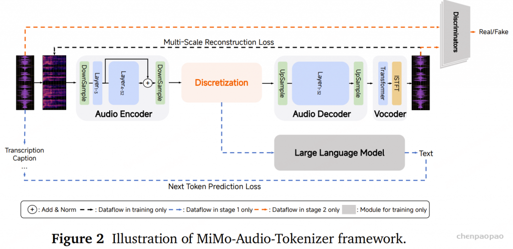 MiMo-Audio-Tokenizer 的架构由四个主要组件组成:音频编码器(audio encoder)、离散化模块(discretization module)、音频解码器(audio decoder)以及声码器(vocoder)。