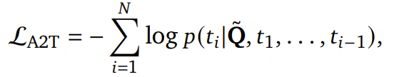 A2T 目标被形式化为 下一个 token 预测损失(next-token prediction loss),作用于 LLM 的文本输出,具体定义如下: