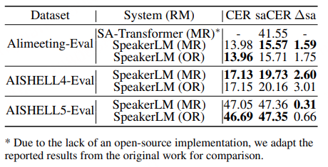 SpeakerLM 在无注册条件下,预测结果中的每个说话人都以匿名 ID 表示。