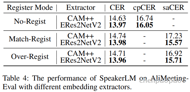 选择ERes2NetV2/CAM++ 作为说话人特征提取模型,在多项说话人验证基准上,ERes2NetV2 的表现优于 CAM++:No-Regist时,ERes2NetV2的CER=13.97%、cpCER=16.05%,都比CAM++低——说明“说话人embedding质量”会影响SpeakerLM性能,好的embedding能让模型更准识别说话人。