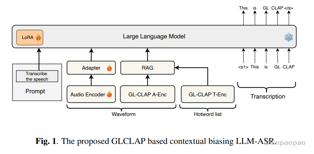 GLCLAP 检索器以音频信号 x 及候选偏置词集合 G={g1,g2,…,gN}作为输入,其中 N 表示候选词表的规模。该检索器由两个组件构成:音频编码器(A-enc)和文本编码器(T-enc)。对于输入音频,A-enc 提取一个固定维度的音频嵌入表示,记为 haudio。同时,候选集合中的每一个偏置词 gi∈G 通过 T-enc 编码为对应的语义向量 ei​,从而得到文本嵌入集合 E={e1,e2,…,eN}。随后,我们计算 haudio 与集合 E 中所有文本嵌入之间的相似度得分,并选取得分最高的 top-k 个偏置词,构成子集 G′。这些被选中的偏置词随后被拼接到偏置提示(bias prompt)中,以引导模型进行上下文感知的转写。