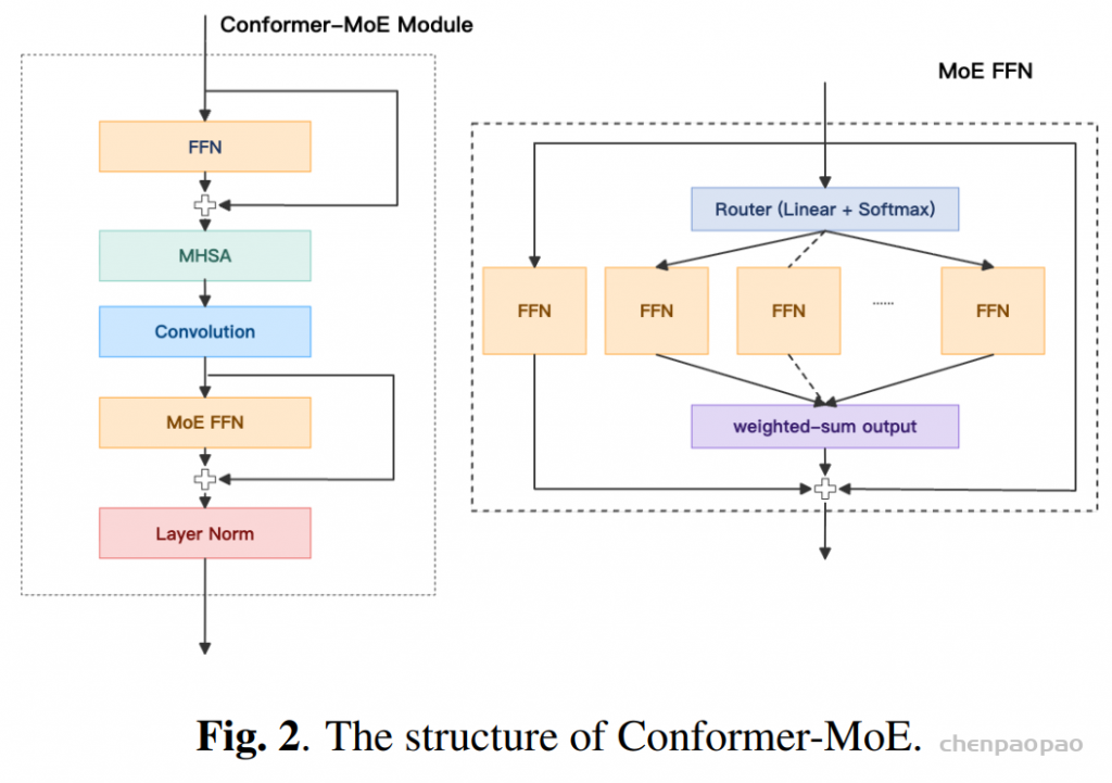 LLM-ASR 网络由音频编码器、适配器以及LLM三部分组成。本文选用 Qwen2.5-7B 作为 LLM 主体。在音频编码器方面,将原始的 Conformer 编码器扩展为 Conformer-MoE 编码器,具体做法是在每一层 Conformer 中,将第二个前馈网络(FFN)模块替换为混合专家(MoE)结构。我们定义了 KC个候选专家,并通过router从中选择 KS个专家进行加权聚合,同时保留一个专用的共享专家以提供通用建模能力。