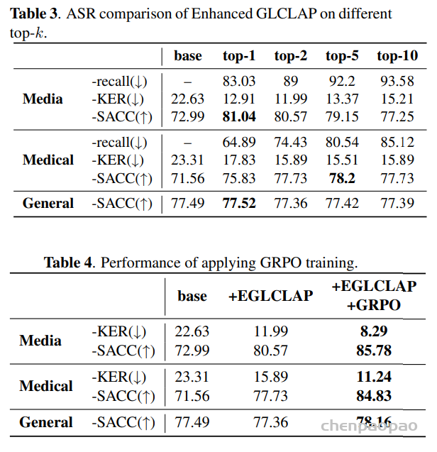 GRPO 训练的结果表 4,引入 GRPO 可以在媒体和医疗设备上的 KER 中产生明显的性能提升。 此外,得益于GRPO中使用的基于准确性的奖励,通用任务的句子准确性也得到了显着提高。