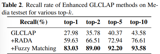MediaMedical 测试集上评估基于 GLCLAP 的热词检索性能。如表 1 和表 2 所示,鲁棒性感知数据增强(RADA)与模糊匹配策略均对整体性能产生了正向贡献。具体而言,原始热词词表约包含 60 万条词项,在应用 RADA 筛选后缩减至 9.8 万条。模糊匹配不仅更契合我们的评测指标,同时也更真实地反映了实际应用场景中的偏置词使用情况。此外,结果显示,随着 top-kkk 值的增大,召回率呈持续上升趋势。