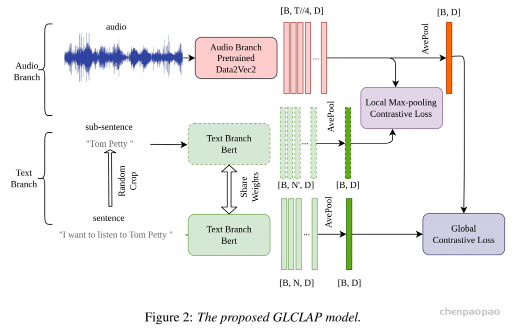 音频分支:音频输入是“梅尔频谱”(Mel spectrogram),用Data2Vec2.0-large当编码器(Transformer结构,自监督预训练过,支持中英)。这里有个巧思:在平均池化前后都做对比学习——因为音频的局部信息是“时序相关”的,直接池化会丢信息。