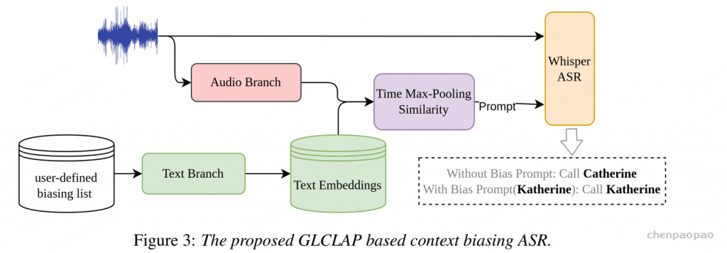 - 先准备“用户定义的偏向词列表”(比如[“Catherine”, “Katherine”]),把这些词输入GLCLAP的文本分支,生成文本embedding(形状[K,C],K是列表长度);